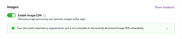 - Remediation Option 2: Disable Image CDN for your site(s). Since this vulnerability only affects websites that have Image CDN enabled, disabling the feature will eliminate vulnerability. Please note that disabling Image CDN will trigger a full rebuild of your site. Once rebuilt and deployed your site will no longer be vulnerable to the flaw.