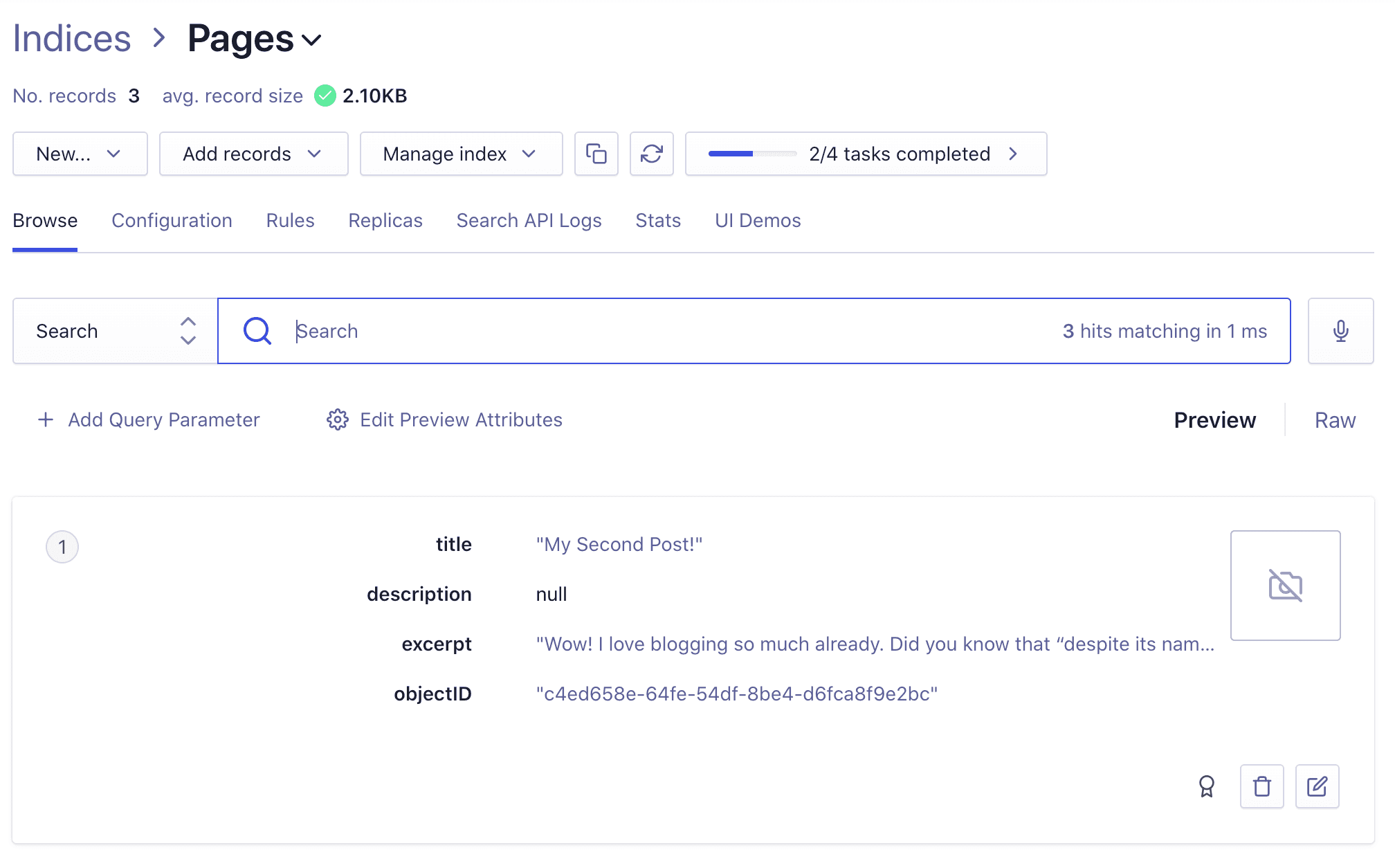 Log in to your Algolia account, go to “Indices” and then select the “Page” index and you should see your indexed page data.