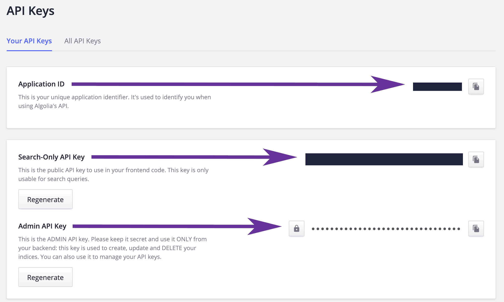 Then, go to the ‘API Keys’ section of your Algolia profile. It should look like this screenshot, only with letters and numbers instead of black boxes: