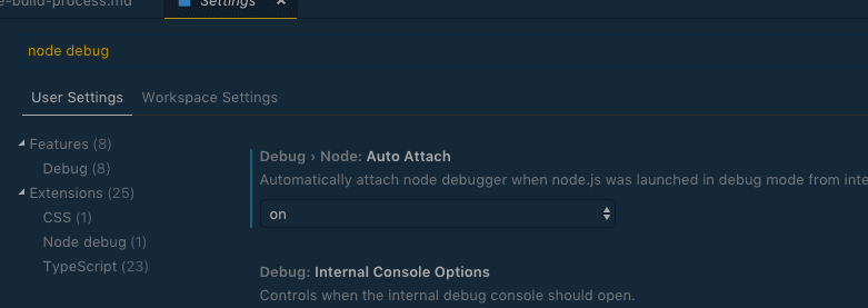 Ctrl + ,or⌘ + ,to open your preferences. Typenode debuginto the search bar. Make sure theAuto Attachoption is set toon.