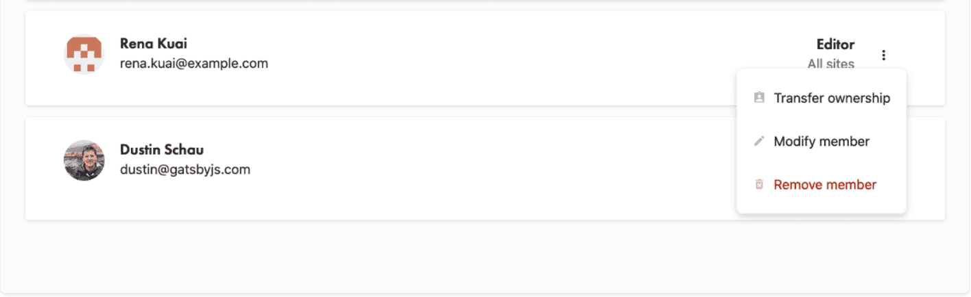 - “Remove Member” - This will remove the Member from the Workspace. It will not delete their Gatsby Cloud account, but they will no longer be able to access this Workspace.