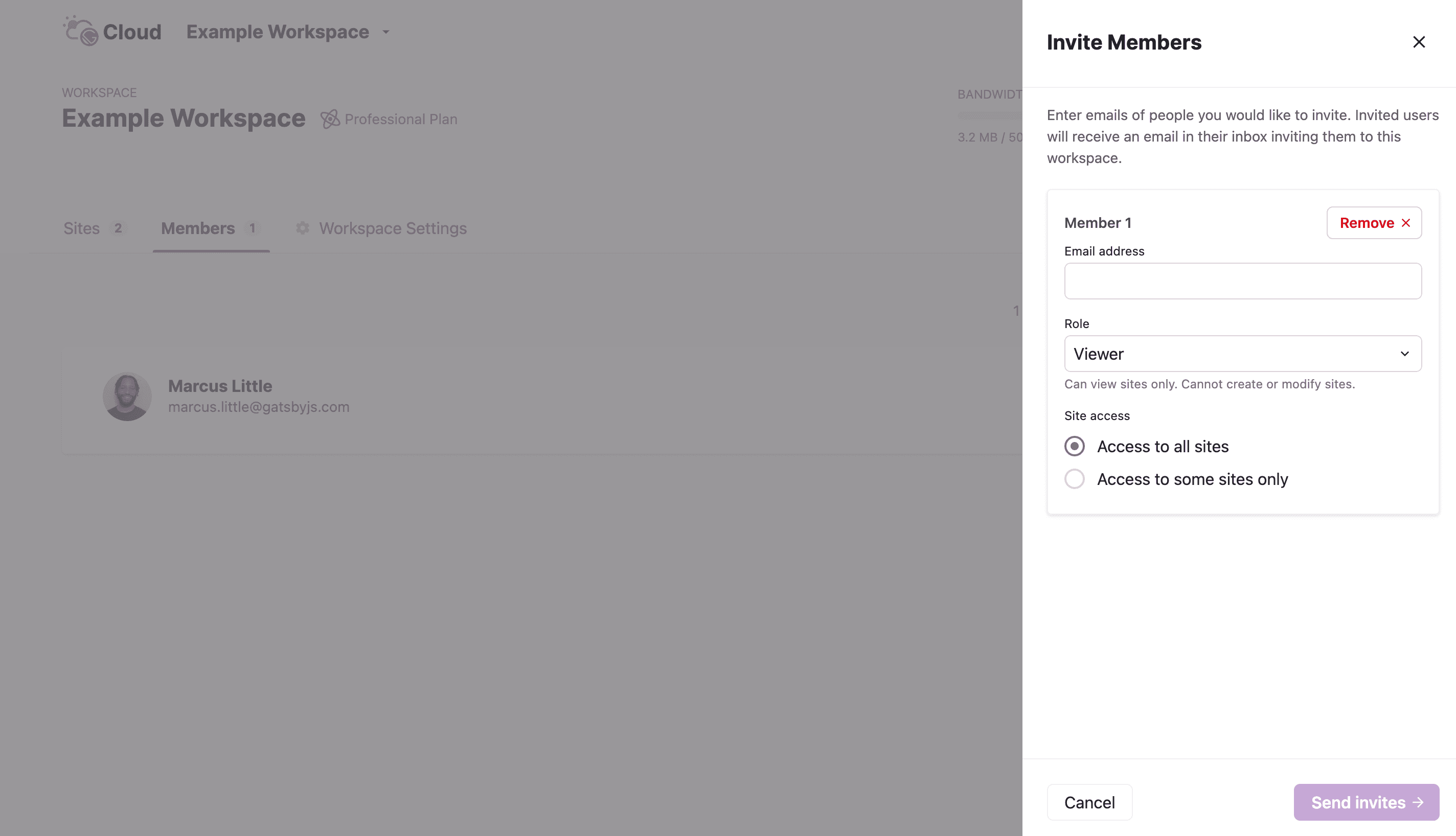 Once opened, enter the email address of the person you’d like to invite to your Workspace. Then, choose their role in the Workspace and what sites they should have access to.