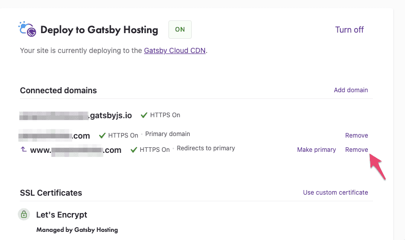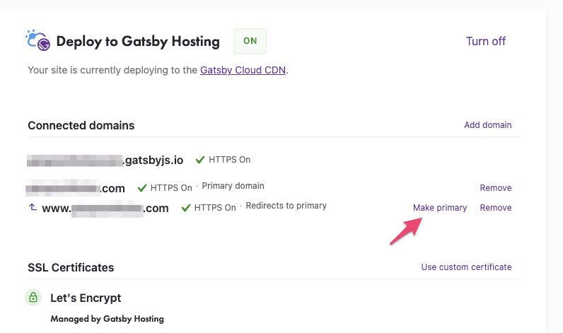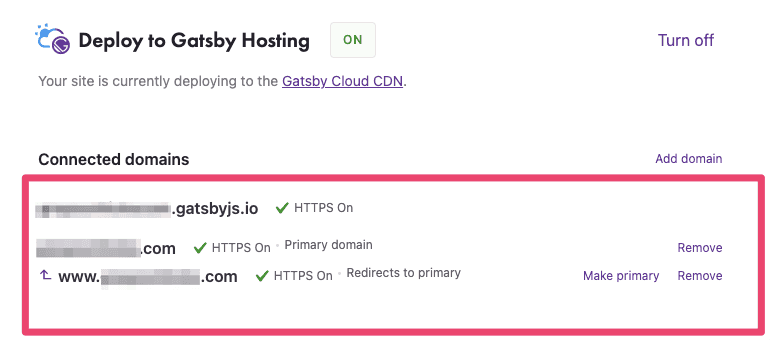 wwwsubdomain to your Gatsby Hosting configuration. You can read more about adding a domain in Adding a Custom Domain.You should see a redirect pair of domains with the domain you entered as a “Primary domain”.