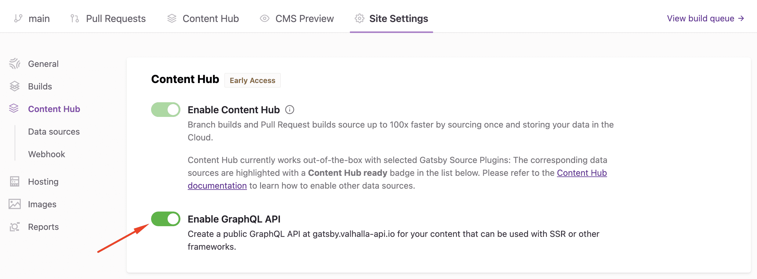 - In your Gatsby Site on Gatsby Cloud, navigate to “Site Settings” tab and select the “Content Hub” item in the left sidebar.