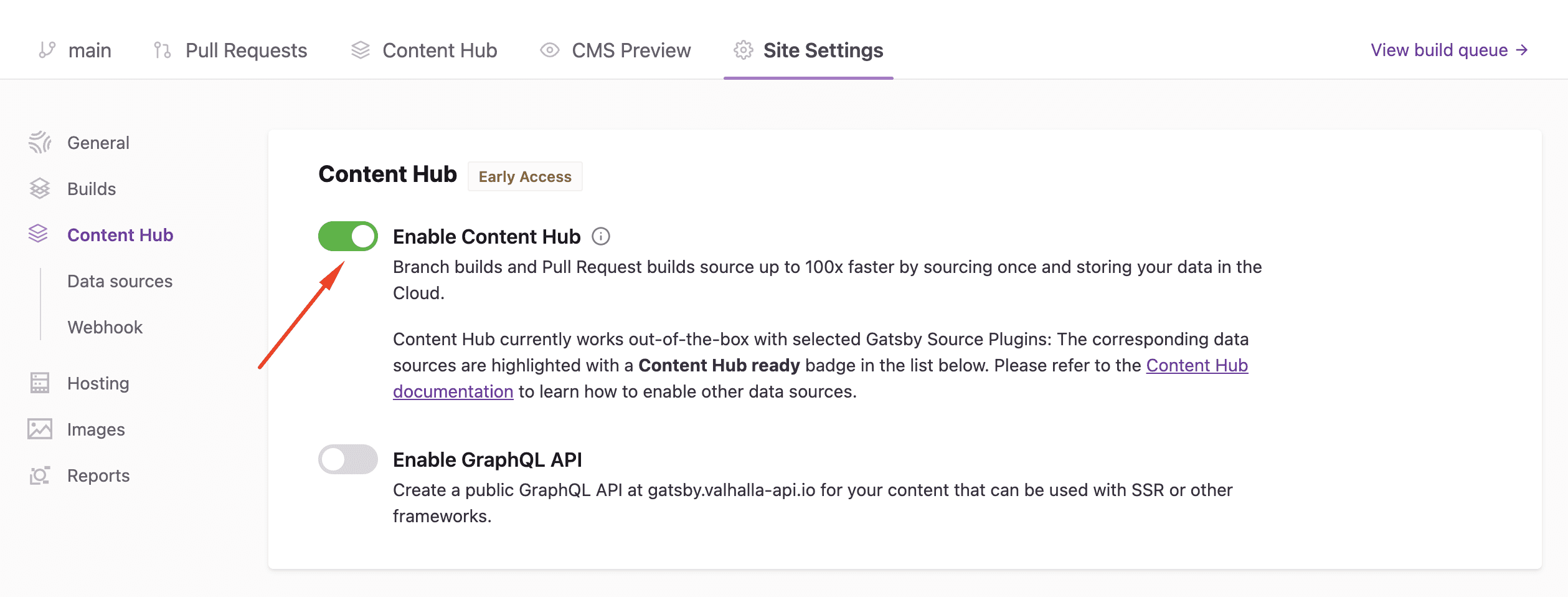 - Valhalla Content Hub must be turned on for your Gatsby Cloud workspace before it can be enabled on your Gatsby site.