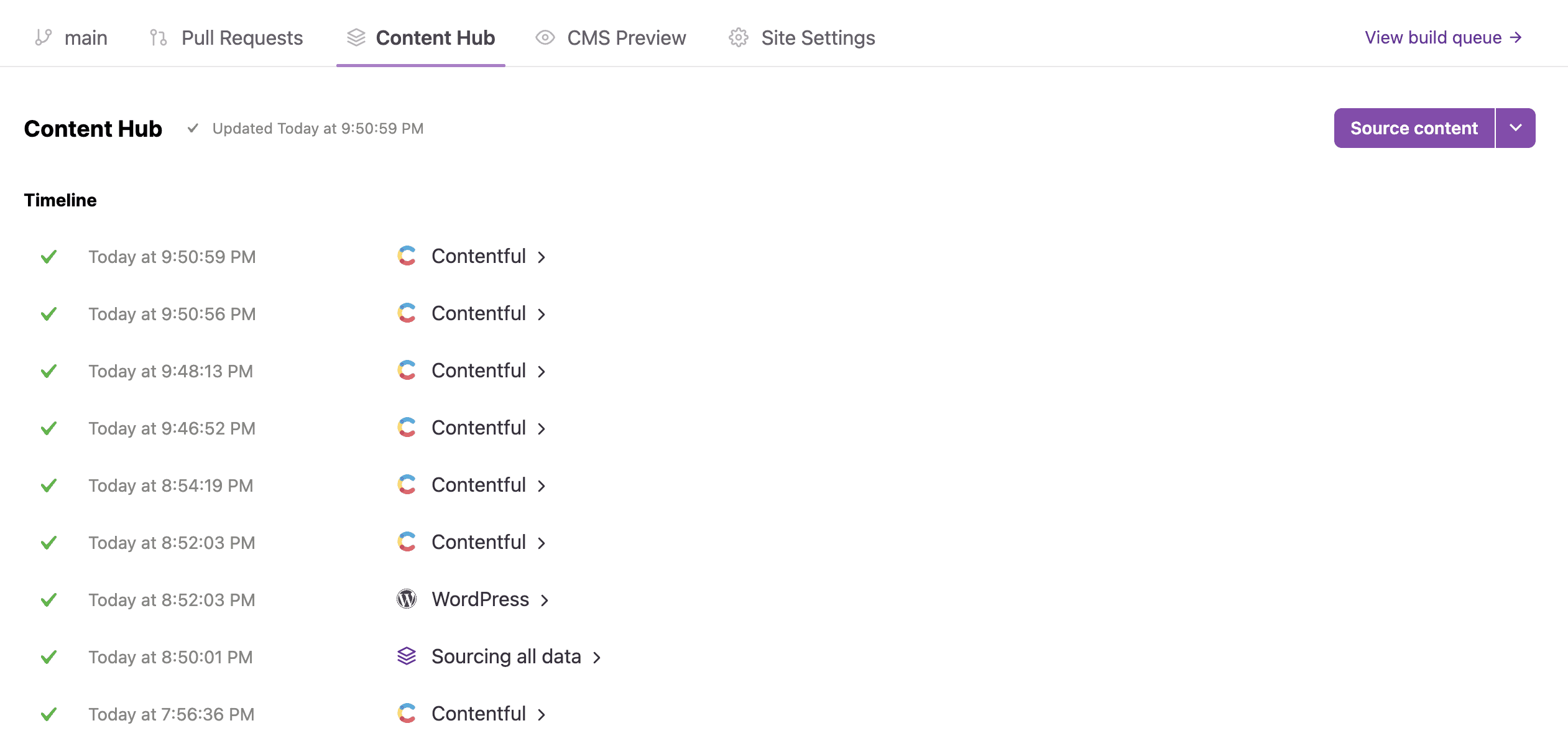 Not every build can use Content Hub. If you are changing your source plugin configuration options, for example, your sourced content might need to change. In this case, your Gatsby build will fall back on sourcing content from your CMS API the same way it does today. If those changes are merged that sourced content will be cached in Content Hub and used in subsequent builds.
