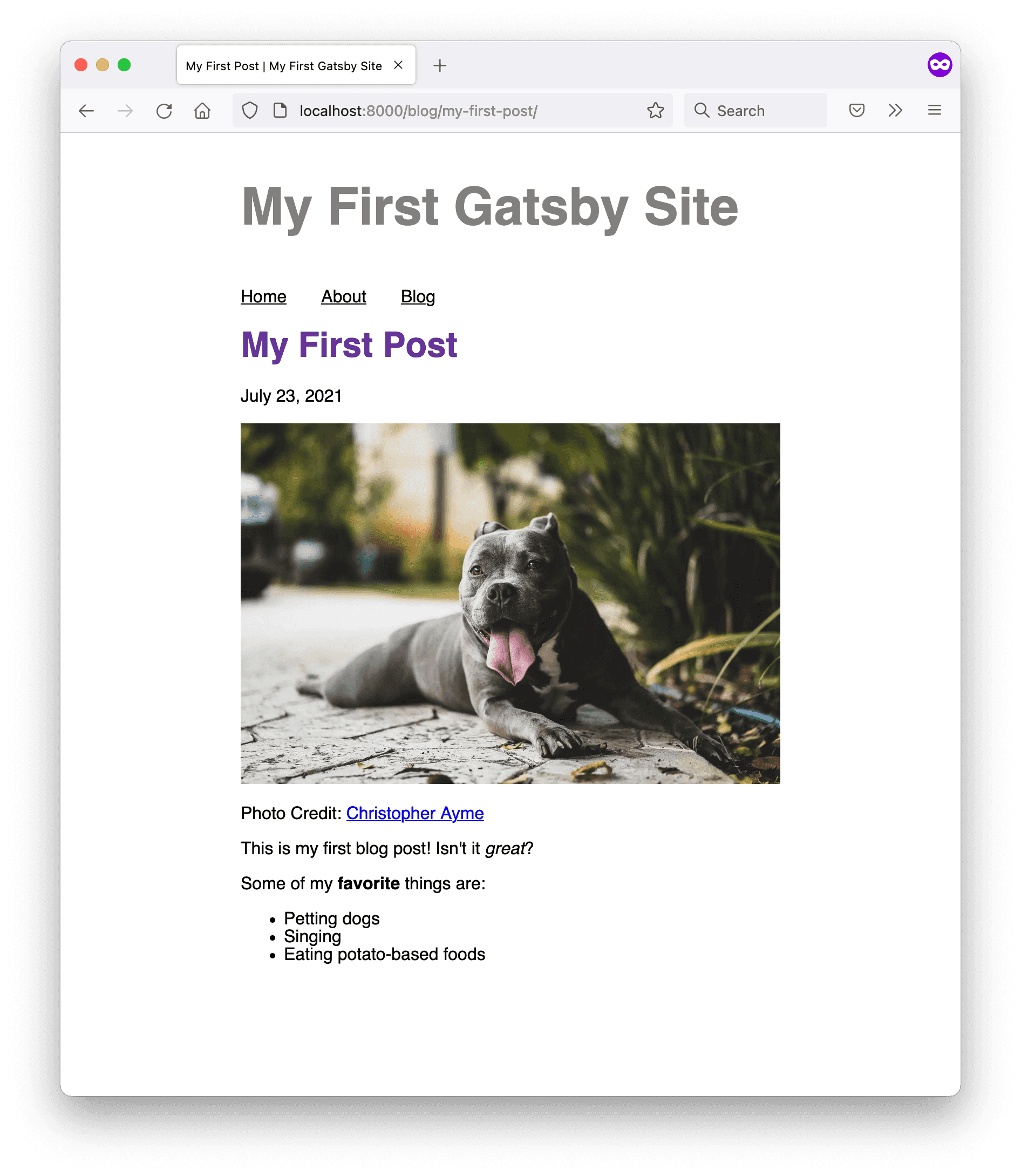 Pro Tip: Since the credit link goes to an external page (in other words, one that’s not part of your site), you can use the <a> HTML tag instead of the Gatsby Link component.